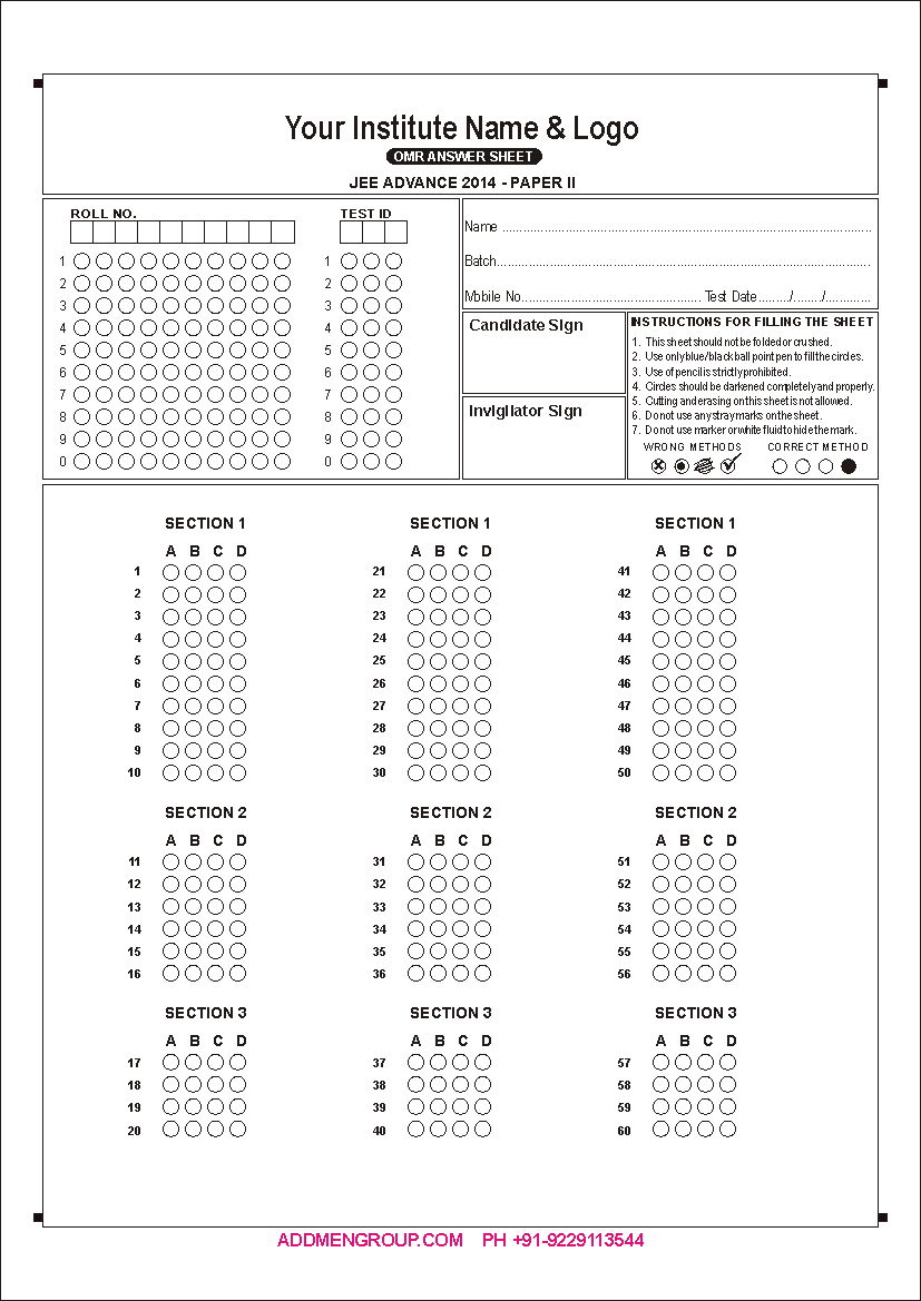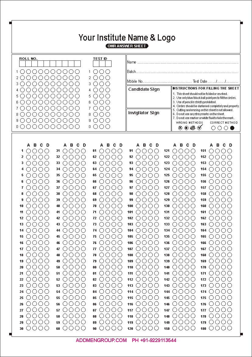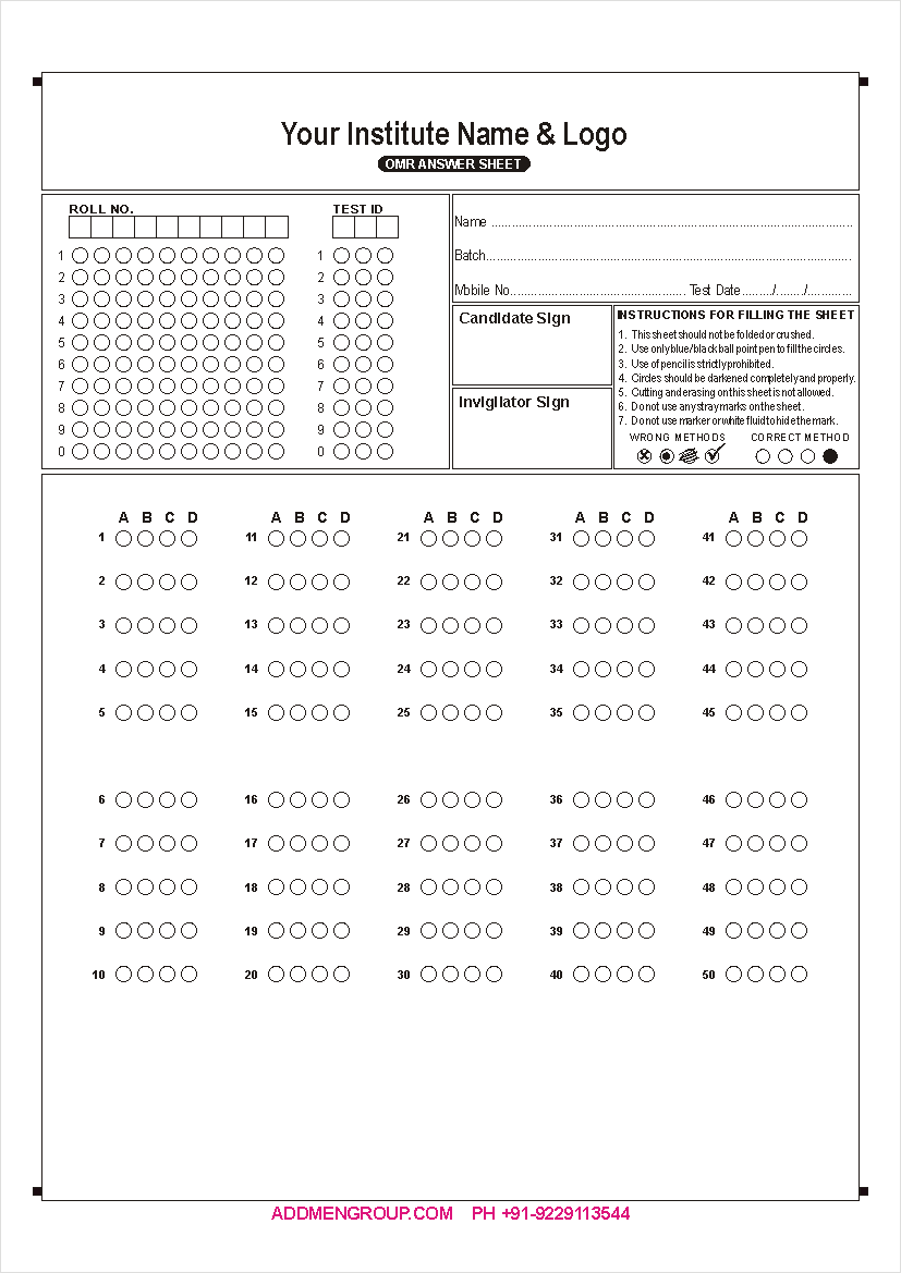 OMR Sheet Download - OMR Sheet Sample Format PDFThe Addmen OMR software has become the most popular OMR software today. This is because it possesses multiple features that were not present in the old OMR scanning machine. Moreover, processing the OMR sheets with this software is easy as well as efficient. One of the many features of this OMR software is that it can be used to design the OMR sheets. The OMR sheet design software is an inbuilt feature and is available with the OMR answer sheet checker software as well as OMR form reader software. This software makes it possible to design different types of OMR sheets on your own. It helps to make you self-sufficient as you do not have to rely on anyone else for designing and printing the sheets. Although the OMR software makes it easy to design the sheets, you also have the option of downloading the sheets if you want to. We offer a variety of readymade OMR sheets that you can use according to your requirements. After downloading the sheets, you can edit them in CorelDraw and add the details of your institute. However, do not make any alterations to the index points or OMR bubbles. After this, you can print the sheets using an inkjet or laser printer. OMR Sheet Samples - OMR Sheet Format for practiceHere are some OMR sheet samples that you can download for free. How to fill OMR Sheets?The OMR sheets contain bubbles, boxes or circles. Students or candidates have to fill these bubbles. However, there are some rules that one has to follow while filling these bubbles. These rules are important to make sure that the sheets are accurately by the OMR software. Filling the OMR Bubbles